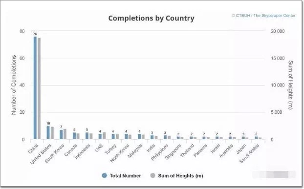 雖然地理多樣性不斷上升,中國(guó)仍然保持摩天大樓建設(shè)的世 界 領(lǐng) 先地位,完成了超過(guò)200米的新建筑的53%。事實(shí)上,今年的深圳完成了12座這樣的建筑,比其他任何一個(gè)國(guó)家都多。美國(guó)排名第二,2017年有10座新落成的摩天大樓。
