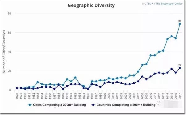 CTBUH在報(bào)告中概述了今年高層建筑設(shè)計(jì)的趨勢(shì)。值得注意的是,2017年是高層建筑在歷史上是zui具地域差異的一年,23個(gè)國(guó)家的69個(gè)城市完成了新的塔樓,2016年從54個(gè)城市和18個(gè)國(guó)家大幅增加。其中28個(gè)城市和8個(gè)國(guó)家完成了新的zui高的建筑物。