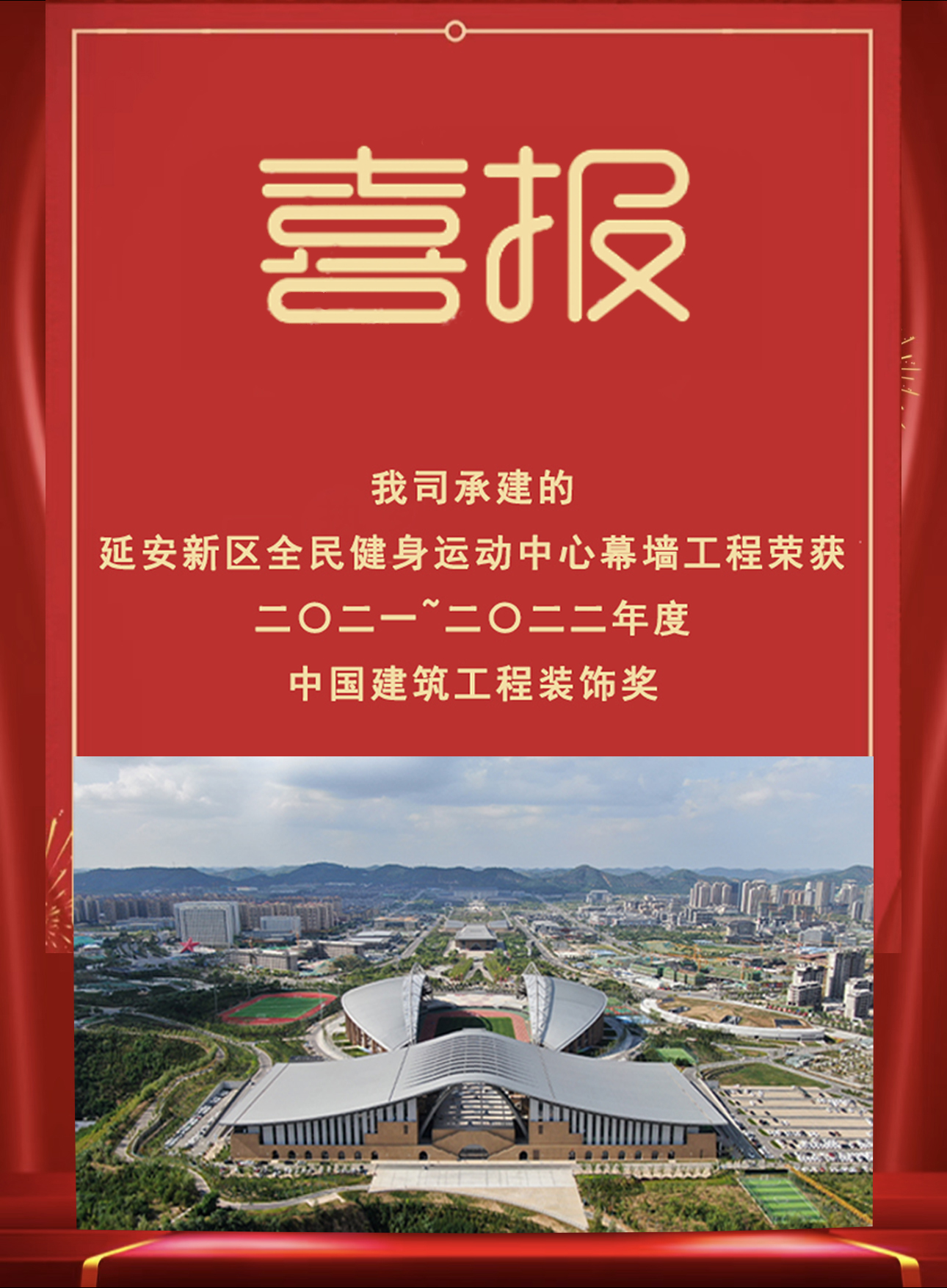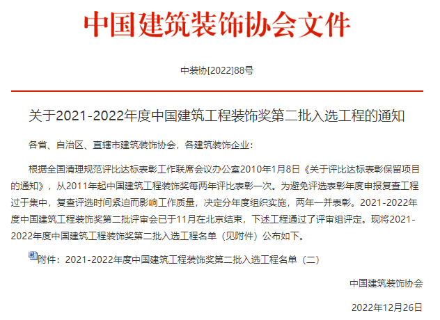 2022年12月26日,中國建筑裝飾協(xié)會發(fā)文《關(guān)于2021-2022年度中國建筑工程裝飾獎第二批入選工程名單》的通知,其中我司承建的延安新區(qū)全民健身運動中心項目綜合體育館幕墻工程獲此殊榮。