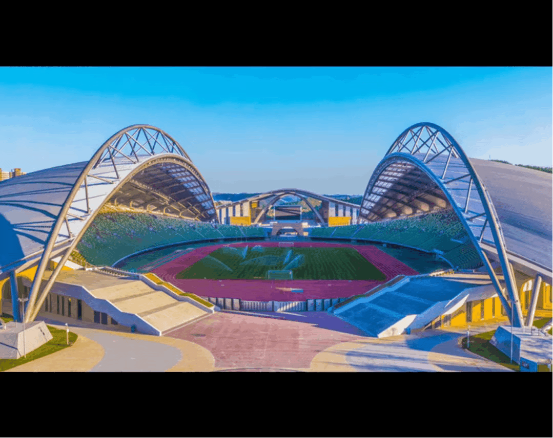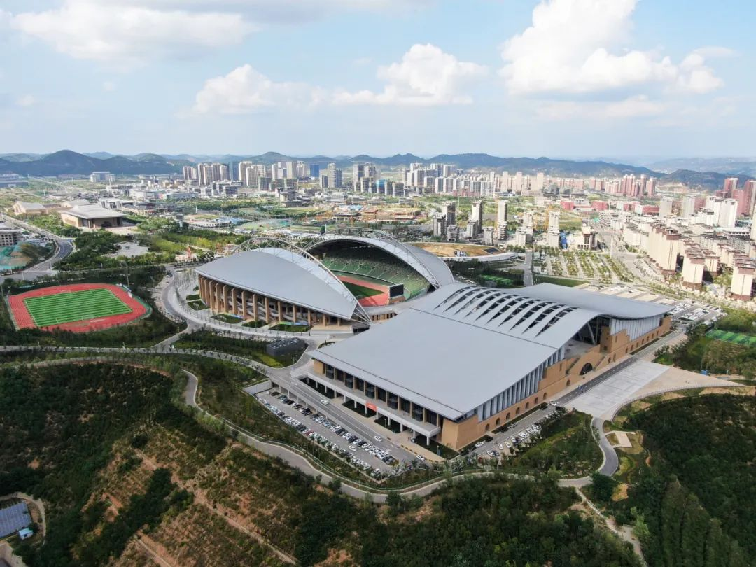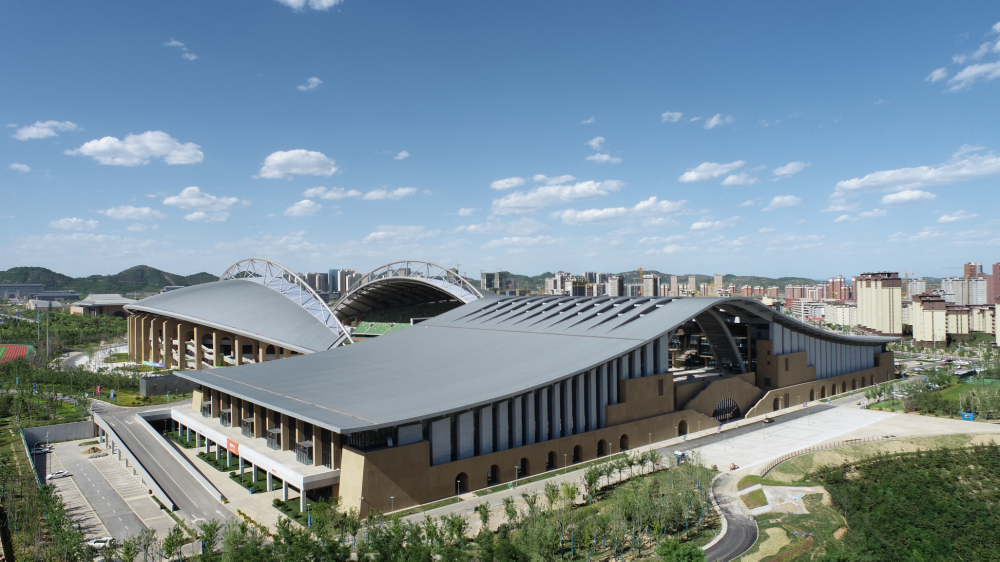 延安全民健身運動中心項目呼應(yīng)延安新區(qū)城市設(shè)計中軸線序列對稱打開的總體格局,巧妙利用地形現(xiàn)狀的特點,“順勢而為”。外觀設(shè)計高度融合延安文化特點,窯洞、拱元素、黃土的元素與建筑設(shè)計巧妙結(jié)合,具有地域特色,建筑以陜北黃為主色調(diào),其他色彩點綴。體育館結(jié)合建筑設(shè)計造型語言的需要,因勢巧借,引入創(chuàng)新的勁性索結(jié)構(gòu),金屬屋面靈動飄逸,與外立面混凝土掛板相映襯,展現(xiàn)延安傳統(tǒng)與現(xiàn)代科技之美。體育場采用拱桁架、單向鋼梁結(jié)構(gòu),采光帶即是結(jié)構(gòu)體系,又是功能需要。立面造型即是結(jié)構(gòu)功能,又是延安本土元素。整個項目外立面幕墻效果造型厚重,在符合當?shù)靥厣那疤嵯掠謽O具現(xiàn)代感。