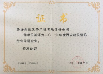 恭賀我公司榮獲“2016年西安建筑裝飾行業先進企業”榮譽